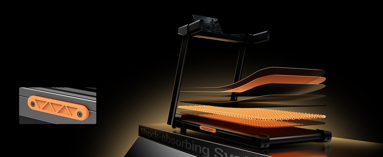 - Triple cushioning: This treadmill with incline for home uses a 7-layer composite treadmill technology, combined with 8 built-in high-performance dampers and 2 external cushioning mats that form a comprehensive cushioning system. It effectively absorbs impact forces and reduces stress on the joints, so you can feel the flexibility and elasticity of a plastic treadmill with every run.