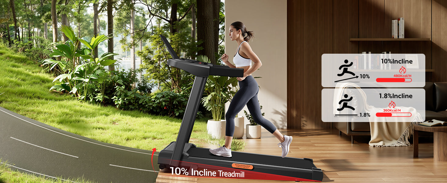 - 10% incline: This folding treadmill for home is equipped with 10% adjustable incline, simulates a realistic mountain running experience, increases calorie consumption by 60% and improves knee protection by 30%, reducing the risk of injury. It also strengthens cardiovascular endurance by 20% and allows efficient home training.