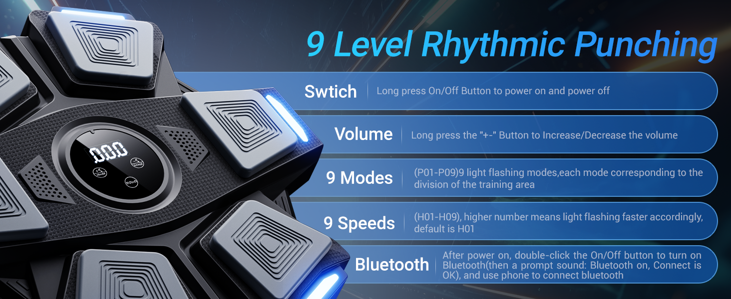 - 💪[Professional Music Boxing Machine] The music boxing machine is equipped with 9 modes and 9 speeds to meet the needs of most people. When the boxing target lights up and you hit it with your fist, you get a count. The punching machine can improve your reaction speed and body coordination. The boxing machine is the perfect professional boxing trainer and daily exercise tool that can be used by professional boxers, fitness people, weight loss people, children, teenagers, office workers, etc.