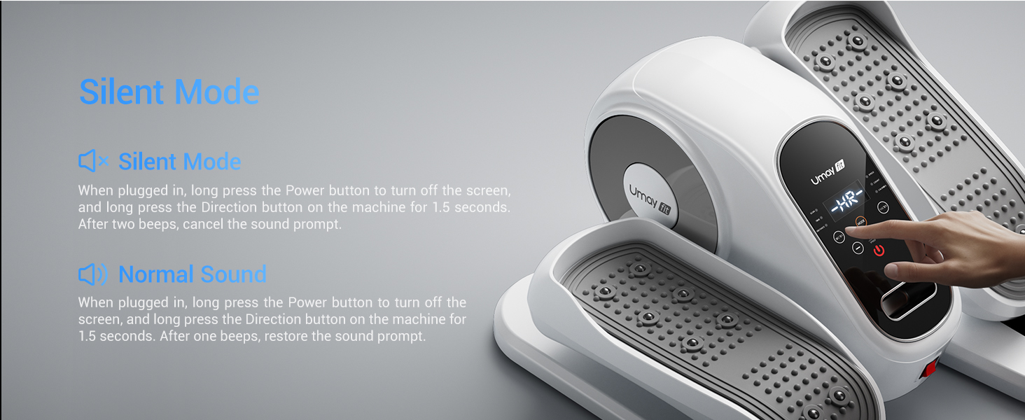 - Mute Setting: UAMY pedal exerciser equipped with the latest mute system<15dB, which ensures a ultra quiet workout even at a high speed for you worry free use. When plugged in, long press the Power button to turn off the screen, and long press the Direction button on the machine for 1.5 seconds. After two beeps, cancel the sound prompt, and follow the same steps to restore normal sound