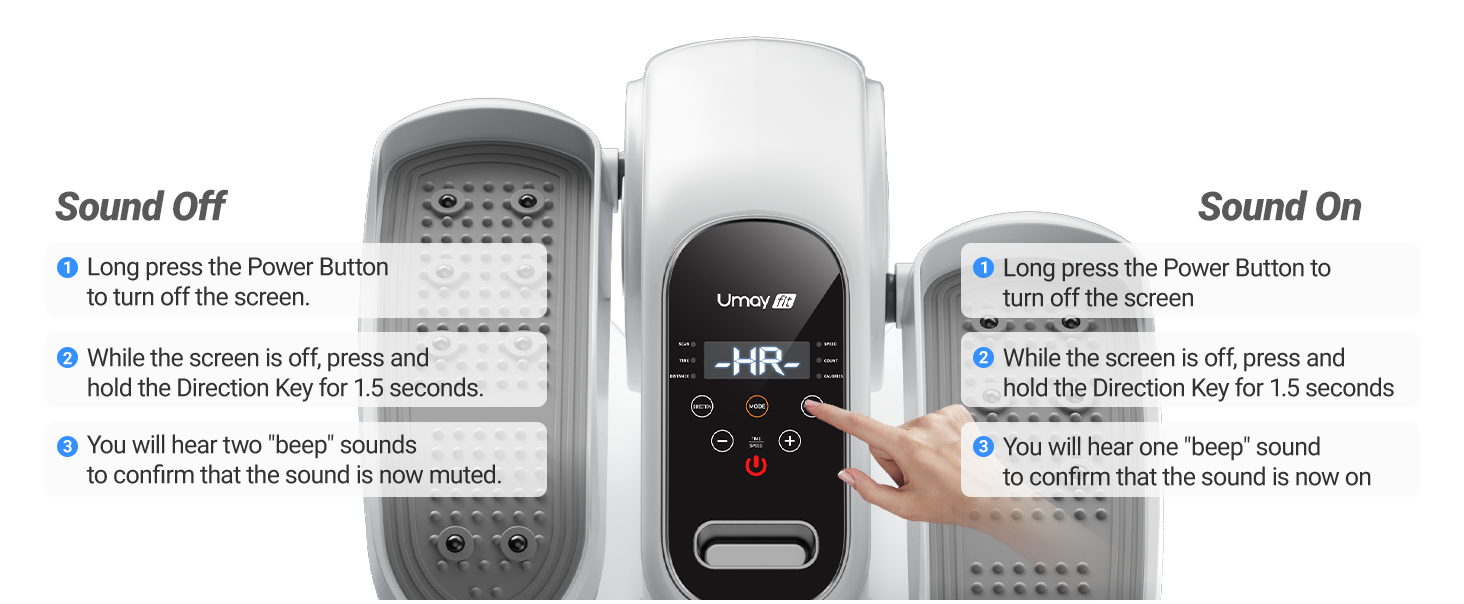 - Mute Setting: UAMY pedal exerciser equipped with the latest mute system<15dB, which ensures a ultra quiet workout even at a high speed for you worry free use. When plugged in, long press the Power button to turn off the screen, and long press the Direction button on the machine for 1.5 seconds. After two beeps, cancel the sound prompt, and follow the same steps to restore normal sound